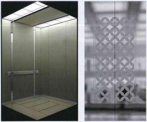 轎壁:后壁中間板的兩側(cè)鏡面不銹鋼,其余(含后側(cè)中間板)金屬板烤漆(啞香檳金漆)(橫向條紋狀),底部鏡面不銹鋼踢腳線
