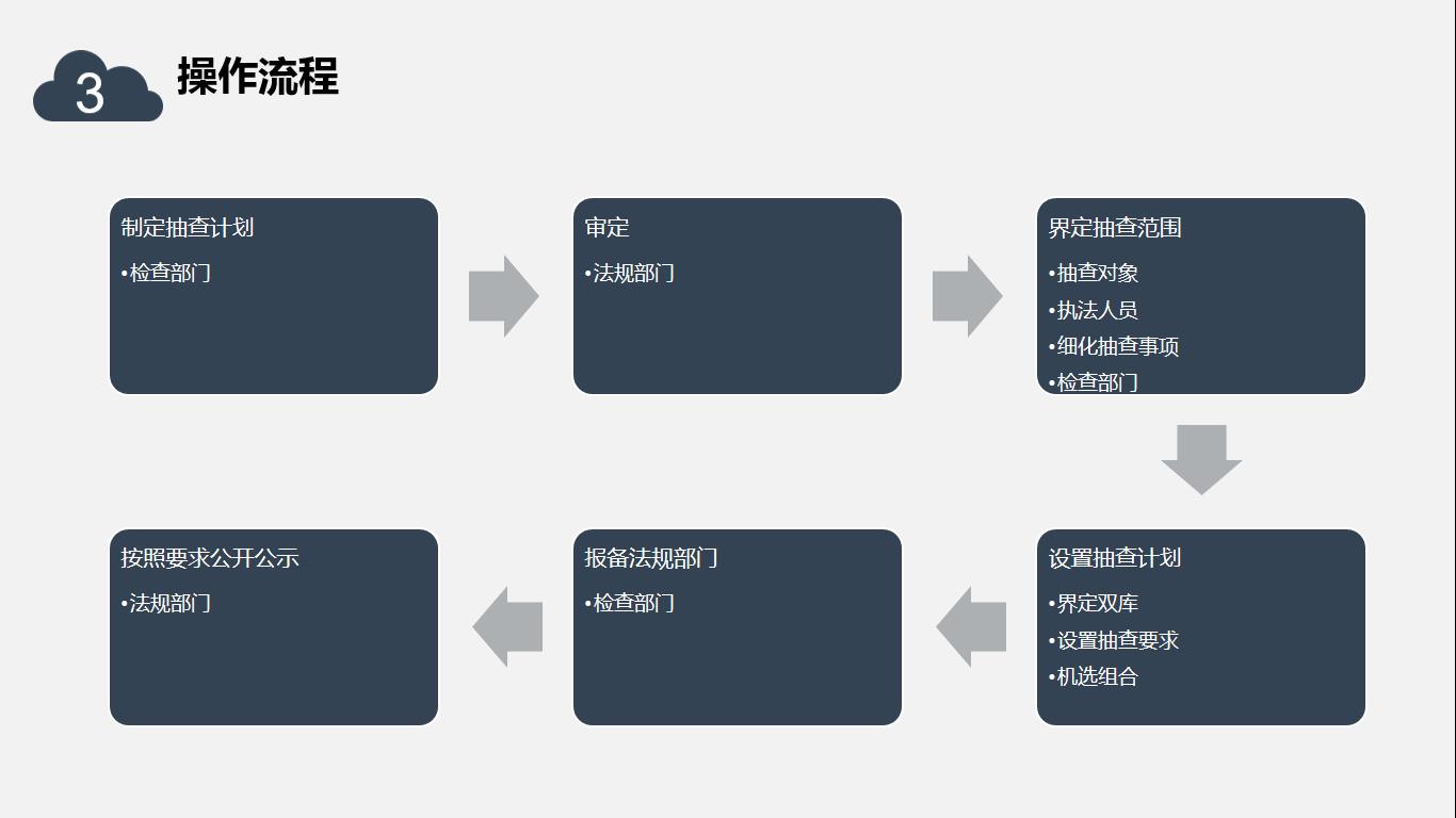 首先根據各種設定的抽取規則在檢查對象名錄庫中隨機抽取檢查對象,再從執法人員中通過隨機的運算抽取出相對應的執法人員,實現執法檢查的公正、公平、透明。